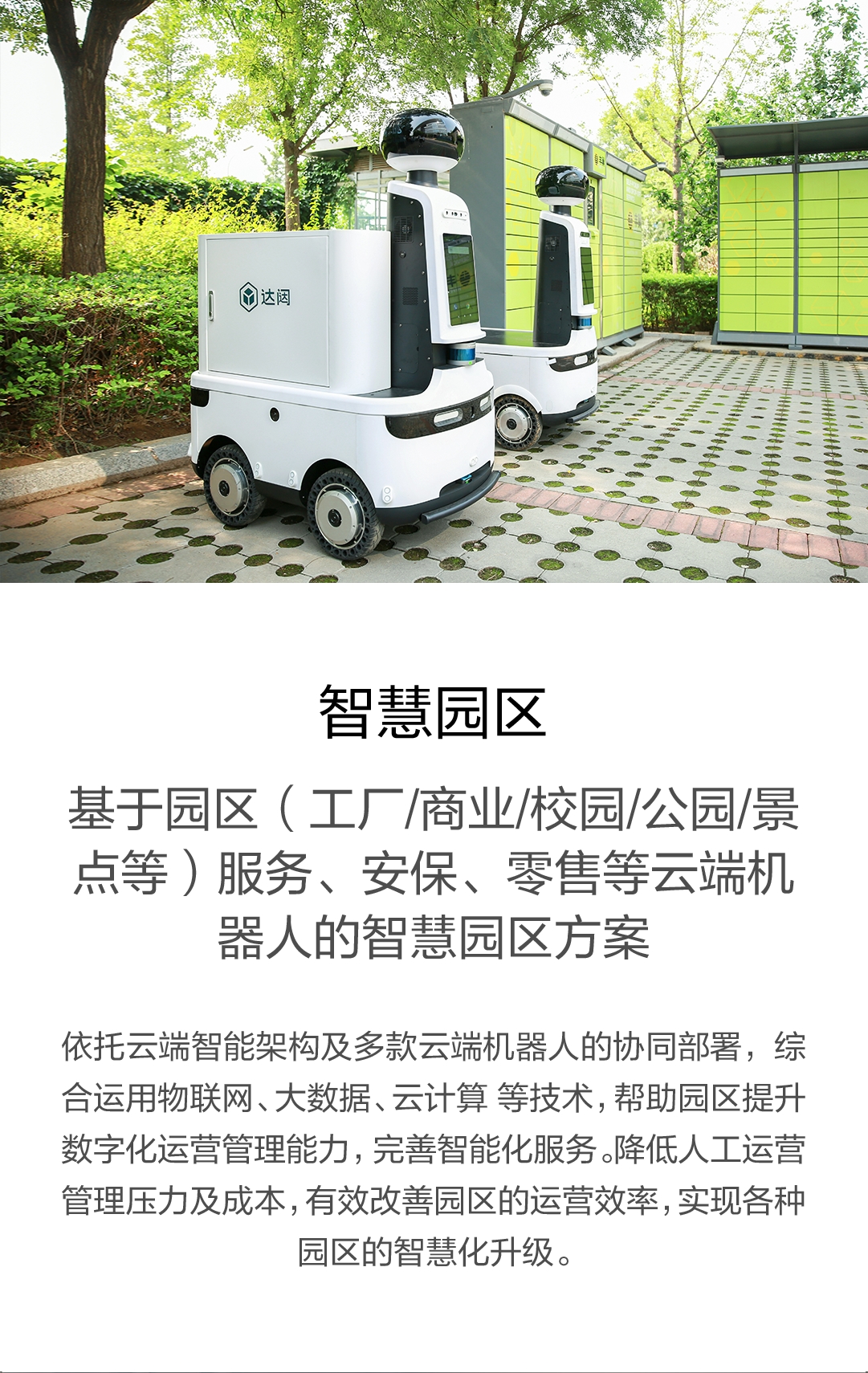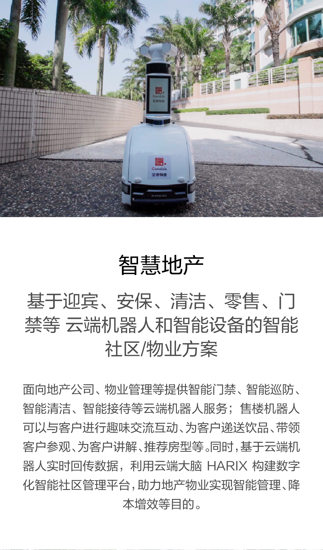 面向地产公司、物业管理等提供智能门禁、智能巡防、智能清洁、智能接待等云端机