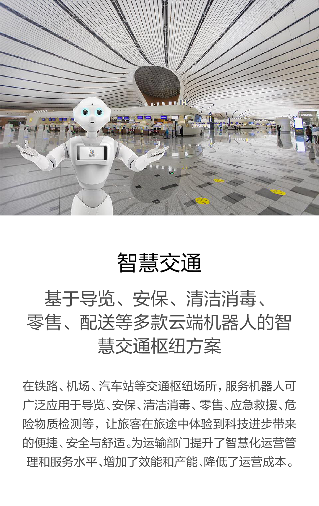 基于导览、安保、清洁消毒、零售、配送等多款云端机器人的智慧交通枢纽方案